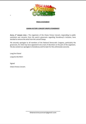 Part of the statement reads, “the organisers of Ghana Victory party responding public sentiments and concerns from the party’s grassroots regarding Stonebwoy’s inclusion, have decided to remove the artist from the concert lineup(sic).”