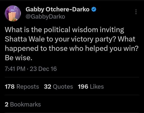 While at it, a tweet by Gabby Otchere Darko in 2016 questioning why Shatta Wale should be included in a list of performers for a victory party by the NPP has also popped up.
