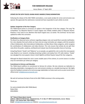 The statement also asserts that, “This rule prevents vote-splitting and ensures that artists have the most substantial chance of winning. (Read also: A dive into TGMA 26 nominations, DopeNation did not file for 2025 TGMA – Robert Kla, PRO of Charterhouse, TGMA26 ‘Big 5’ nominees: Hits and misses)