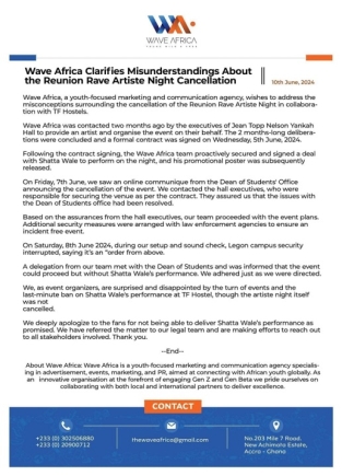 According to a press release issued by the agency today, June 10, they were contacted two months ago by the executives of Jean Topp Nelson Yankah Hall to provide an artiste and organise the event on their behalf.