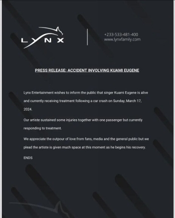 Lynx Entertainment signee, the management label of musician Kuami Eugene, has disclosed that the artiste is alive and receiving treatment after a car crash yesterday night.