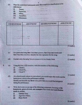 Specifically, Question 5(c) in Section B asks students to write brief notes on any of the following composers: Ephraim Amu, Agya Koo Nimo, or Black Sherif, focusing on their hometown, genre of work, a notable example of their work, and their contribution to society.