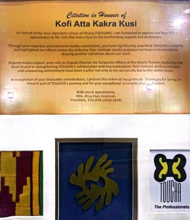 Tour Operators Union of Ghana (TOUGHA) has honoured Kofi Atta Kakra Kusi, Deputy Director of Corporate Affairs, Ghana Tourism Authority (GTA), for his exceptional contributions to the sector.