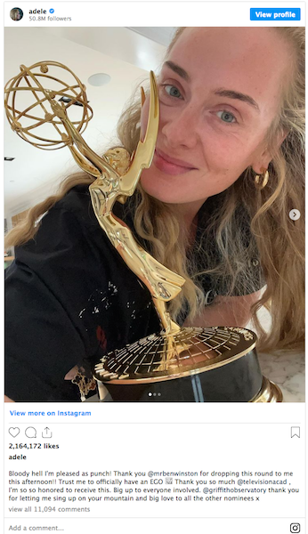 "Big up to everyone involved," said Adele. "@griffithobservatory thank you for letting me sing up on your mountain and big love to all the other nominees."