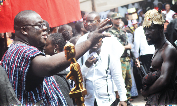 Sammy Awuku, National Youth Organiser of the NPP, responding to cheers from party faithfuls at Manhyia Palace.