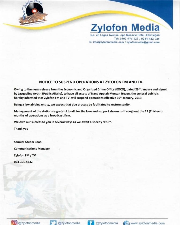 “Owing to the order by the Economic and Organised Crime Office (EOCO) dated 29th January and signed by Jacqueline Avotri (Public Affairs), to have all assets of Nana Appiah Mensah frozen, the general public is hereby informed that Zylofon FM and TV will suspend operations effective 30th January 2019,” the statement reads.
