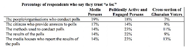 As you can see from the table, there is a deep mistrust of polls on all five dimensions across all three key groups surveyed. Even more concerning is the low level of trust among the cross-section of Ghanaian voters who are the respondents to these polls.