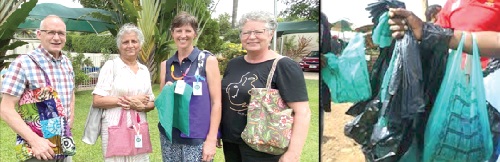 Alternative to single use plastics is the cloth shopping bags (arrowed) showcased by participants in a conference
