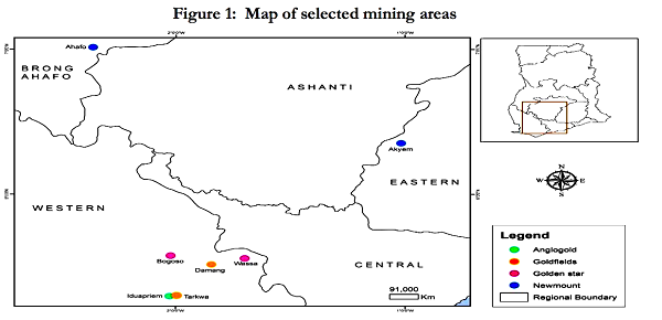 Gold is the major mineral exploited in the mining industry and contributes substantially to the industry’s output in terms of mineral revenue and production. In view of that, the study concentrated much more on gold mining. The study sampled seven operating mines, but for the purpose of convenience, and without compromising the outcome of the research, these areas were merged into four specific companies as follows; AngloGold Ashanti (Iduapriem), Goldfields Ghana Ltd (Tarkwa & Damang), Newmont (Ahafo & Akyem) and Golden Star (Wassa & Bogoso). Majority of these companies were in a cluster with the exception of Newmont Ghana which is located in both the Eastern and Brong Ahafo Regions of Ghana. Goldfields (Tarkwa & Damang), Golden Star (Wassa &Bogoso) and AngloGold Iduapriem are all located in the Western Region of Ghana.