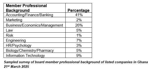 Traditionally, boards have been constituted with bias for predominantly business administrators such as accountants, economists, sales or finance professionals and the occasional membership with some technical background (engineering, telecommunications or IT), specifically related to the core business of the company. The backgrounds of members of the board of a cross-section sample of the listed companies on the Ghana Stock Exchange were analysed with the following results.