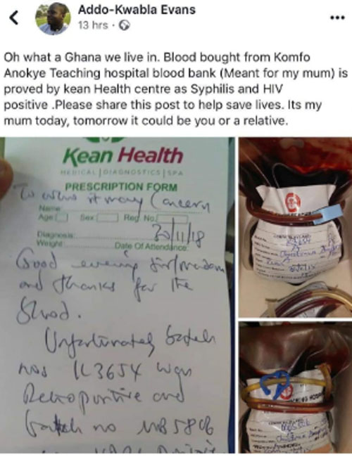Son needs blood for mum on admission at a private health facility. The Komfo Anokye Teaching Hospital (KATH) blood bank official allegedly sells blood to him.