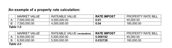 The tables 1.0 & 2.0 above illustrate the two different scenarios—where there are increases in rateable values and decreases in the rate impost to arrive at the same bill. The market value has been intentionally inserted in the table above for emphasis with respect to the rateable value.