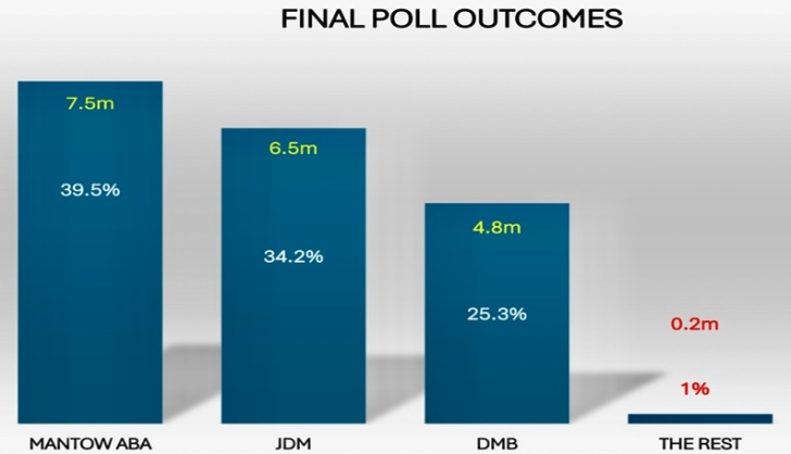 The unseen presidential candidate (Mantow Aba & Friends) attracts 7.5 million votes constituting 39.5% of registered voters, followed by JDM whose 6.5 million now constitute 34.2% and DMB with 4.8 million being 25.3%. The rest of the candidates attract 0.2 million votes being 1% of registered voters.