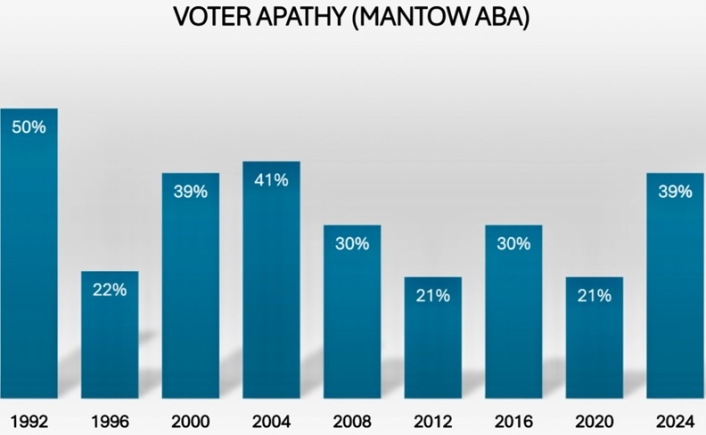 Since 1992, Mantow Aba numbers have oscillated between 21% and 50% of registered voters: 21% being the lowest and 50% the highest.