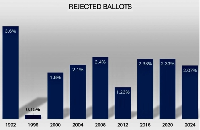 1992 was the worst year ever for rejected ballots, perhaps from the long military rule which dropped ballots out of memory; we recorded 3.6% being the highest rate of rejected ballots in the 4th Republic. That huge deficit on which the 4th Republic started, sharply declined to 0.15% in 1996. From 1996 to date, we have consistently fallen below 2.5% ballot rejects; and were partly comforted when we recorded just 2% in 2024 (provisional figures), demonstrating the relative success of voter education over the years.