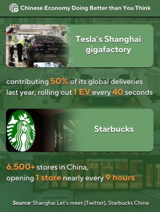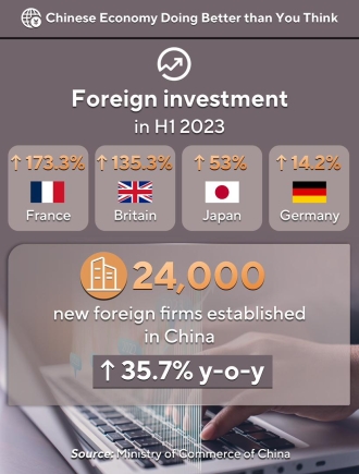 While transnational investment is lackluster globally, overseas investment in China continues to grow. In the first half of 2023, France, Britain, Japan and Germany boosted investment in China by 173%, 135%, 53% and 14% respectively. Some 24,000 new foreign firms were established in China in the same period, up by 35.7% year on year. Half of Tesla’s global deliveries came from its Shanghai mega-factory last year, which rolls out one EV every 40 seconds on average. Starbucks now operates more than 6,500 stores in China, opening one nearly every nine hours.