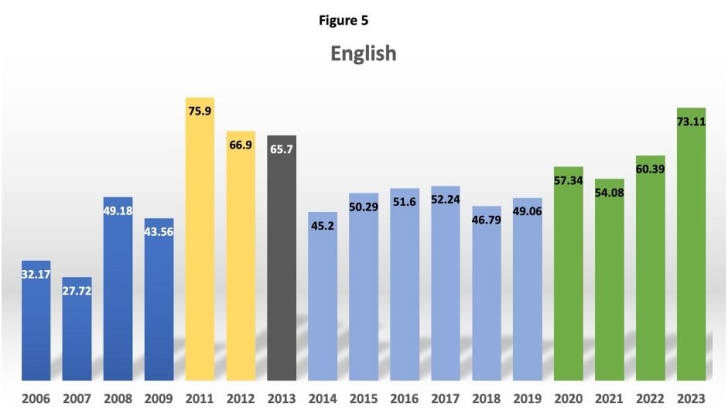 Altogether, while the 2011/2012 4year group averages 71%, the Free SHS group (2020-23) modestly averages 61%. The superiority of the 4year group in English over all other policy cohorts, including Free SHS, is evident.