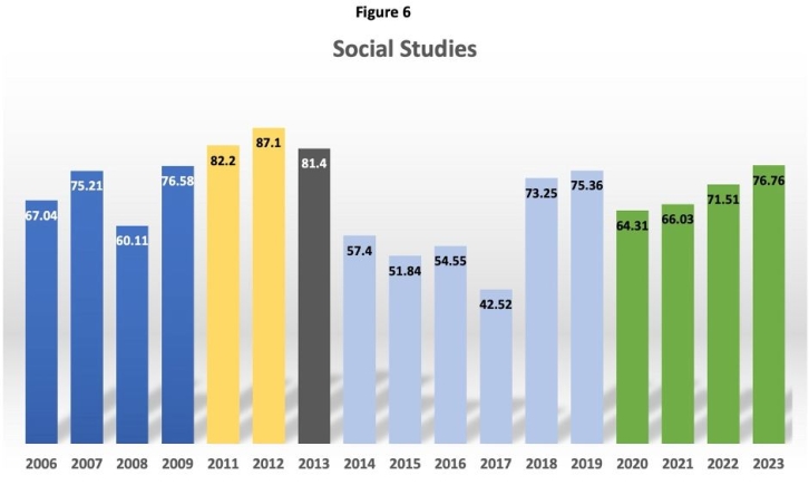 However, the 2020-23 social studies average of 70% falls far below the 85% peak point enjoyed by the 4year cohort by 15 percentage points. The 4year cohort wax highest in social studies.