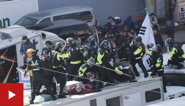 South Korea's Yon hap news agency reported that one was killed when a loudspeaker fell on them, while an elderly man fell from a police van.