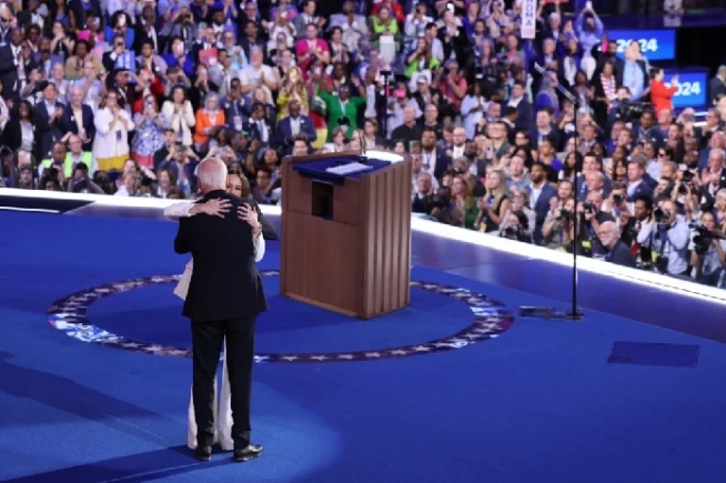 Unlike his Oval Office address four weeks ago, Mr Biden did not speak directly of passing the torch to a new generation - but the message was clear enough. After the president concluded his remarks, Ms Harris and her husband Doug Emhoff came out to embrace Mr Biden and his wife, Jill.