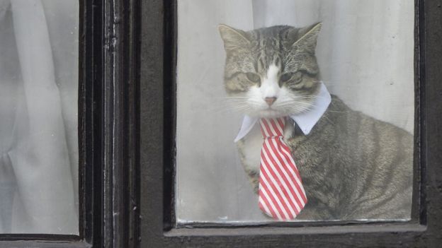 Mr Assange's cat - sporting a tie - kept watch on the crowd outside