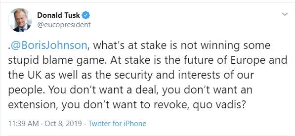 The President of the European Council, Donald Tusk, sent a public tweet to Mr Johnson, writing: "What's at stake is not winning some stupid blame game. At stake is the future of Europe and the UK as well as the security and interests of our people."