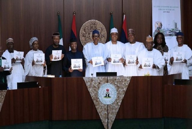 President Muhammadu Buhari flanked by Vice President, Yemi Osinbajo, President of the Senate, Dr Bukola Saraki, Speaker Rt Hon Yakubu Dogara, Zamfara State Governor Alh Abdulaziz Yari, SGF, Engr Babachir David Lawal, Minister of Budget and National Planning, Senator Udoma Udo Udoma, Minister of State Budget and National Planning, Zainab Ahmed CBN Governor, Mr Godwin Emefiele, Minister of Finance, Mrs Kemi Adeosun and APC National Chairman Chief John Odigie-Oyegun during the formal launch of the Nigerian Economic Recovery and Growth Plan (ERGP) at the State House Council Chamber in Abuja.