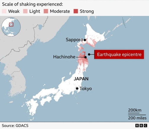 The quake occurred at 23:15 (14:15 GMT) at a depth of 50km (31mi), about 80km off the coast of the Aomori region, the Japan Meteorological Agency said. It prompted tsunami warnings which have now been lifted, while waves of 70cm (27in) were seen.