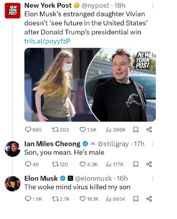 Billionaire Elon Musk has reacted to his transdaughter's latest statement.