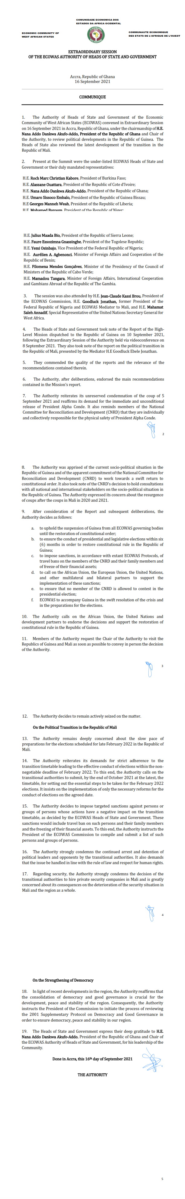 The meeting in Accra, Ghana, on Thursday, 16 September, 2021 concluded that the Republic of Guinea remains suspended from the fold of governing boards of the regional bloc until constitutional order is restored, while all members of the military inspired National Committee for Reconciliation and Development (CNRD) and their families are under travel bans and their financial assets frozen.