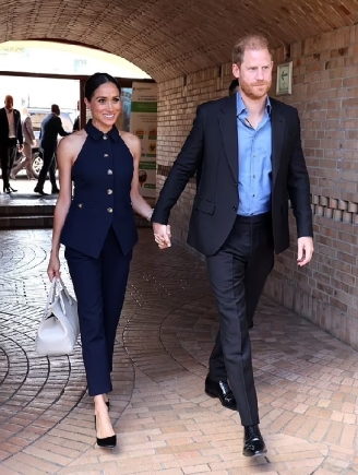 Meghan wore a navy blue summer suit, reportedly by American label Veronica Beard, and carried a light-coloured handbag, while Harry wore a matching dark suit and light blue shirt.