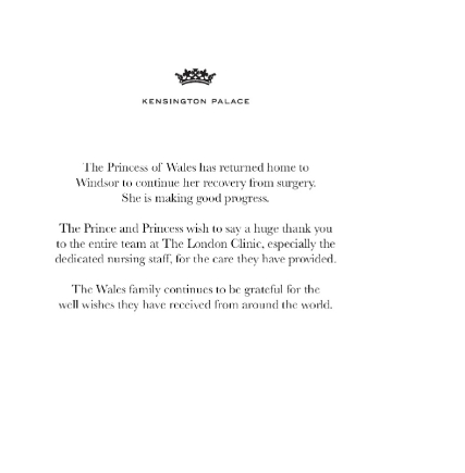 Kensington Palace said the Prince and Princess of Wales wanted to send a "huge thank you" to the medical team at the central London hospital and for the "well wishes they have received from around the world".