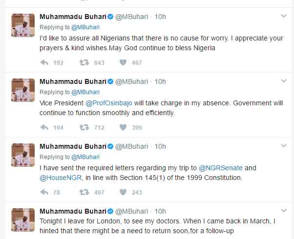 He has handed over power to the Vice President, Prof Yemi Osinbajo and gone to London for the medical tests.