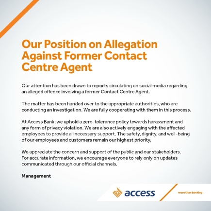 The bank confirmed that the matter has been escalated to the appropriate law enforcement agencies, and that it is assisting affected staff members in the wake of the disturbing revelations. While confirming the employee’s dismissal, Access Bank did not disclose further details, citing the ongoing nature of the investigations.