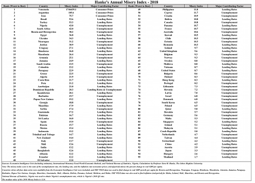 “In the sphere of economics, misery tends to flow from high inflation, steep borrowing costs and unemployment,” Hanke warns.