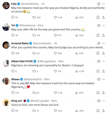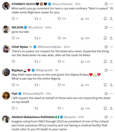 Criticism also extended to the notion of mourning. @GucciStarboi warned: “Mind wetin you go comment for here o, cuz even ordinary 'Rest in peace' fit make some Nigerians swear for you.” This statement reflects the polarised nature of Buhari's impact on the nation.