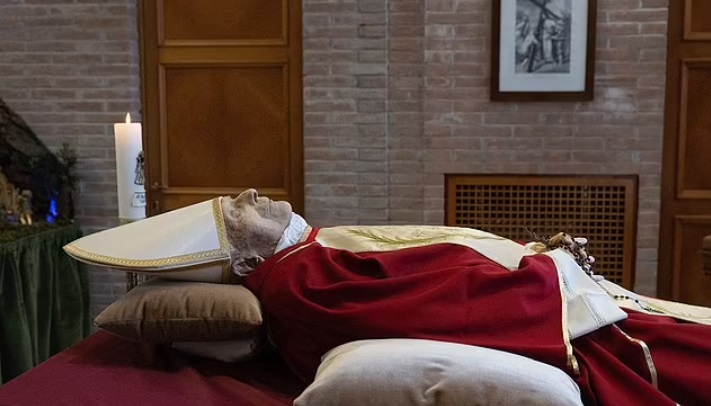 The former pope's body has been dressed in a mitre, the headgear of a bishop, and a red cloak-like vestment in preparation. A rosary was placed in his hand.