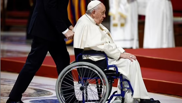 The pontiff looked weary, arriving in a wheelchair to St Peter's Basilica Sunday
