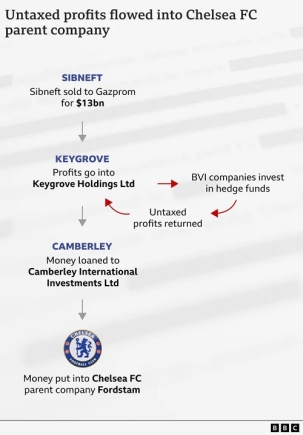 Some of the money that funded Chelsea FC when Mr Abramovich owned it can be traced back to companies involved in the scheme, the BBC and the Bureau of Investigative Journalism (TBIJ) also found.