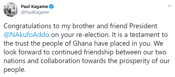 The President of Rwanda, Paul Kagame has congratulated his Ghanaian counterpart President Nana Addo Dankwa Akufo-Addo on his re-election.