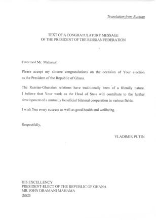 Russian President Vladimir Putin has extended a congratulatory message to Ghana’s President-elect, John Dramani Mahama, following his decisive victory in the December 7 general election.