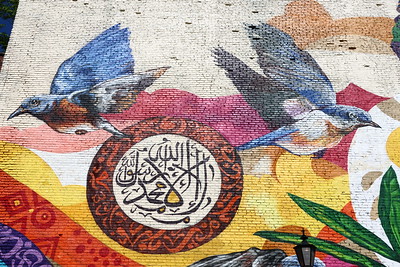 The Arabic word "Iqra," meaning "read," is emphasized, underlining the importance of language in fostering community development and inclusivity. Birds flying throughout the background allude to migration, serving as a reminder to embrace one's roots even when establishing a new home.