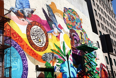 The massive 4,000-square-foot masterpiece took approximately three weeks to complete, and it showcases a powerful and captivating composition. At its forefront, a woman is adorned with a vibrant Dukus (turban), locking eyes with passersby and exuding strength and resilience. Surrounding her, the mural features an array of African iconography and Islamic calligraphy, with Adinkra symbols symbolizing unity, God's supremacy, toughness, and perseverance.
