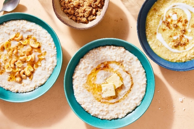 Cooked with only water and salt, the creamy oats can take both savory and sweet toppings.