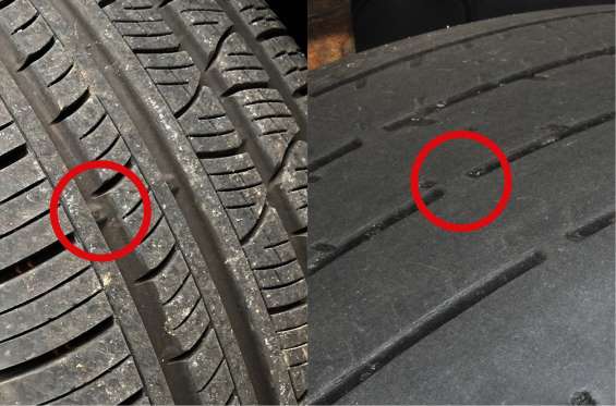 Most tires have tread wear indicators embedded in the rubber near the outside edge of the tire. When your tread is worn down, these indicators will be easily visible and they’ll also make an annoying noise on the road to prompt you to check. You can see an example above (new tire on the left, worn tire on the right). Don’t ignore the noise. Go get new tires.