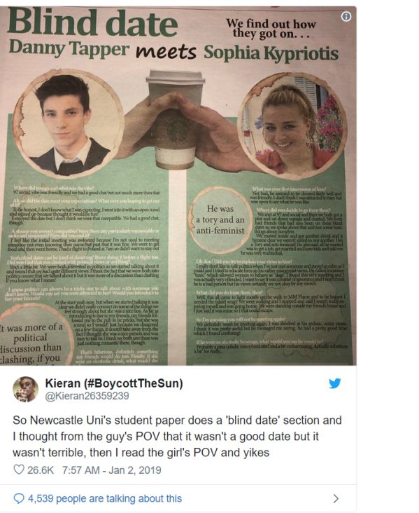A picture of the university paper was shared on Twitter where others shared in the misery of the date which ended with Sophia saying: ‘He was a Tory and an anti-feminist’. ‘He called feminism “toxic” which allowed women to behave as “slags”.