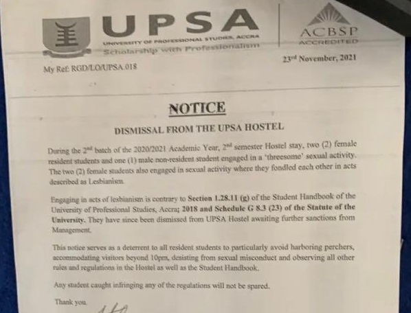 A notice dated November 23, 2021, posted on a notice board on the UPSA campus said the two female students also engaged in sexual activity where they fondled each other in acts described as lesbianism.