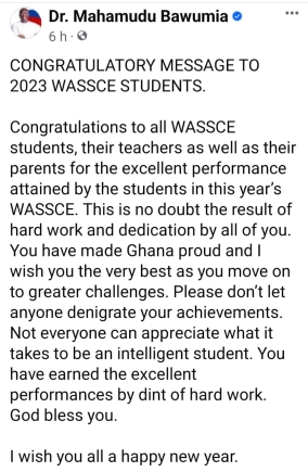 Experts have hailed this year's results as the best since 2015, a testament to the dedication and hard work of all involved. Taking to his Facebook page, Dr. Bawumia celebrated the students, teachers, and parents, writing: "Congratulations to all WASSCE students, their teachers as well as their parents for the excellent performance attained by the students in this year's WASSCE."