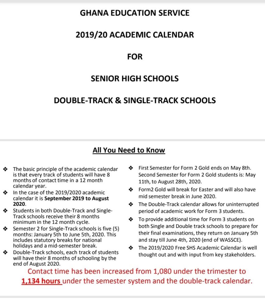 The Ghana Education Service (GES) has released the new academic calendar of 2019/2020 for double-track and single track Second Cycle (Senior High School) Institutions.