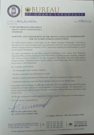 The endorsement follows a thorough assessment by a three-member team, which conducted field visits to schools participating in a pilot program on Ahanta language teaching.